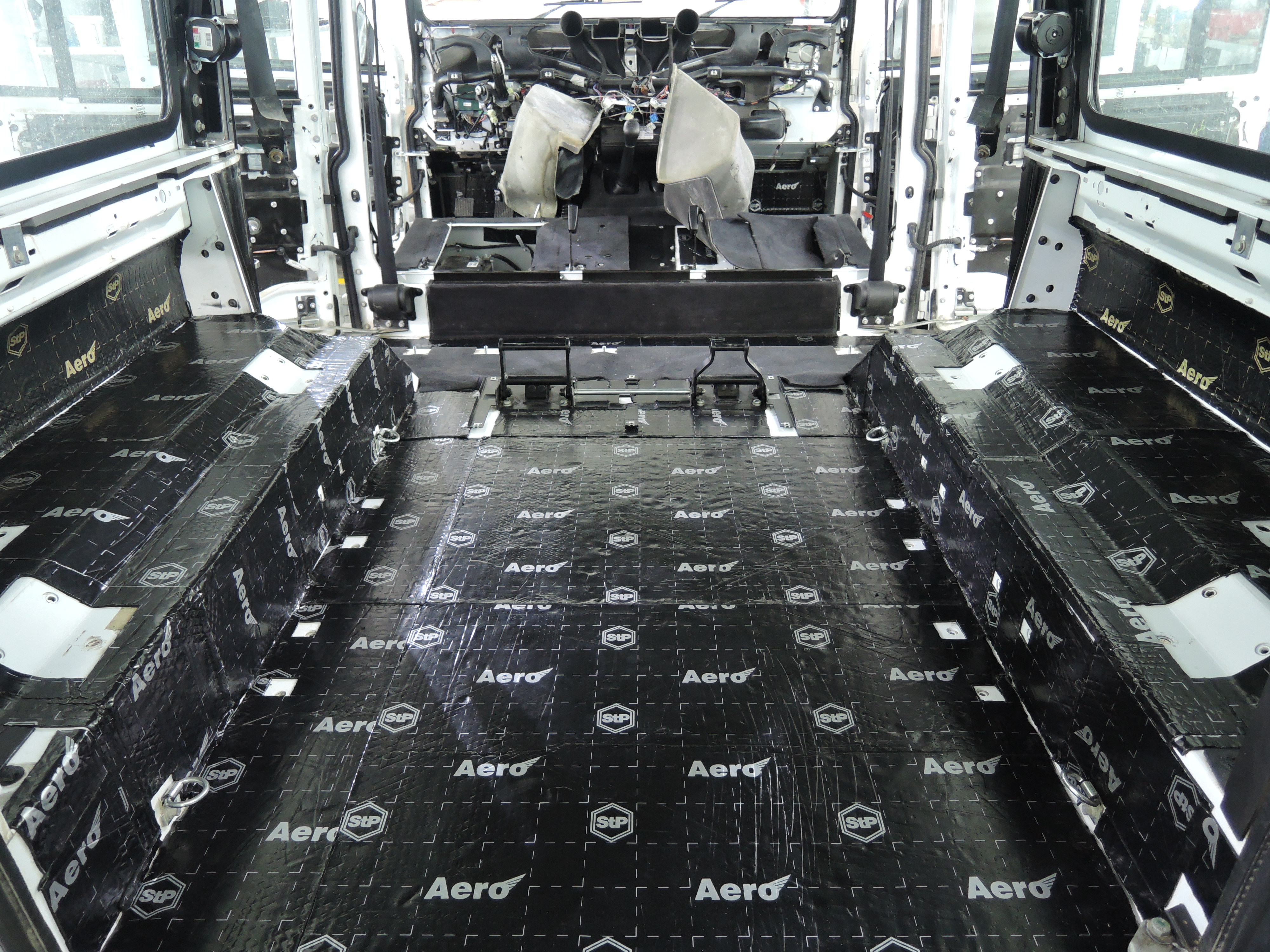 Днище на этом автомобиле мягко говоря своеобразное. Особенно если Деф в кузове пикап! Под передними сидениями находятся ниша АКБ и инструментальный ящик, а перед ними есть возможность проклеить только металл в ногах переднего пассажира и водителя. Зато в задней части после снятия заднего дивана открывается отличный простор для проклейки перегородки между салоном и кузовом, а также часть задних арок. Аккуратно разбираем нижнюю часть салона Лэнд Ровер Дефендер. Первым слоем на металл днища мы наносим виброизолятор СТП АЭРО+ (3 мм). Этот пластичный виброизолятор отлично повторяет сложную рельефную поверхность днища автомобиля, а значит материал после прикатки будет работать максимально эффективно! На фото ниже представлено фото процесса шумоизоляции салона Land Rover Defender 110 со снятием передней панели.