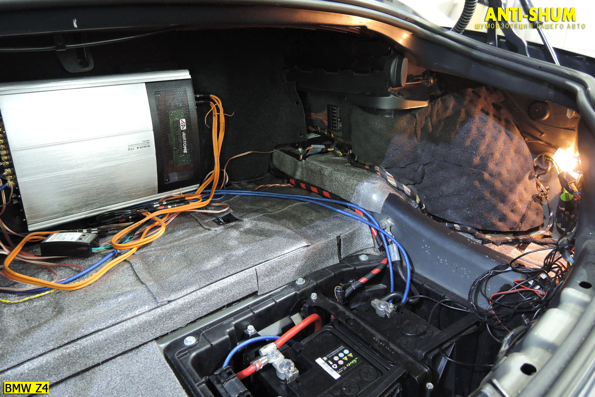 Если Вы думаете, что автомобилю без крыши шумоизоляция не нужна — Вы ошибаетесь! Мы можем сделать более комфортным любой автомобиль, даже кабриолет BMW Z4! Основные жалобы владельца касались рева двигателя и выхлопной системы, а также на массовые скрипы, дребезги и прочие посторонние звуки в салоне. В «наследство» от предыдущего владельца хозяину машины достались обилие нештатной электрики, усилитель и акустика, которые планировалось демонтировать уже после проведения работ по шумоизоляции. Поэтому мы оставили все это в том же виде, в каком оно было по приезду в нашу студию… Ну а все остальное Вы можете увидеть на фото ниже…