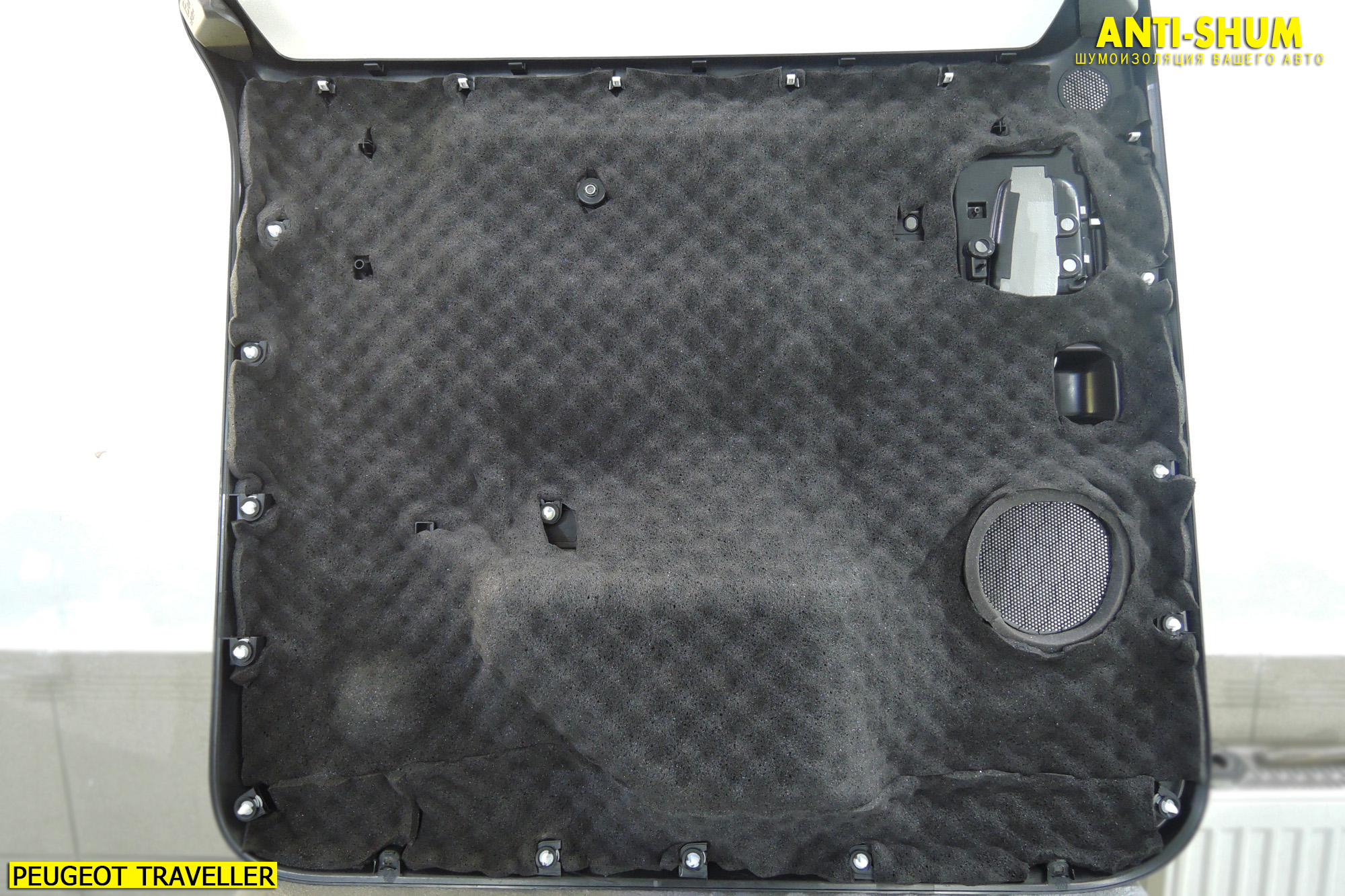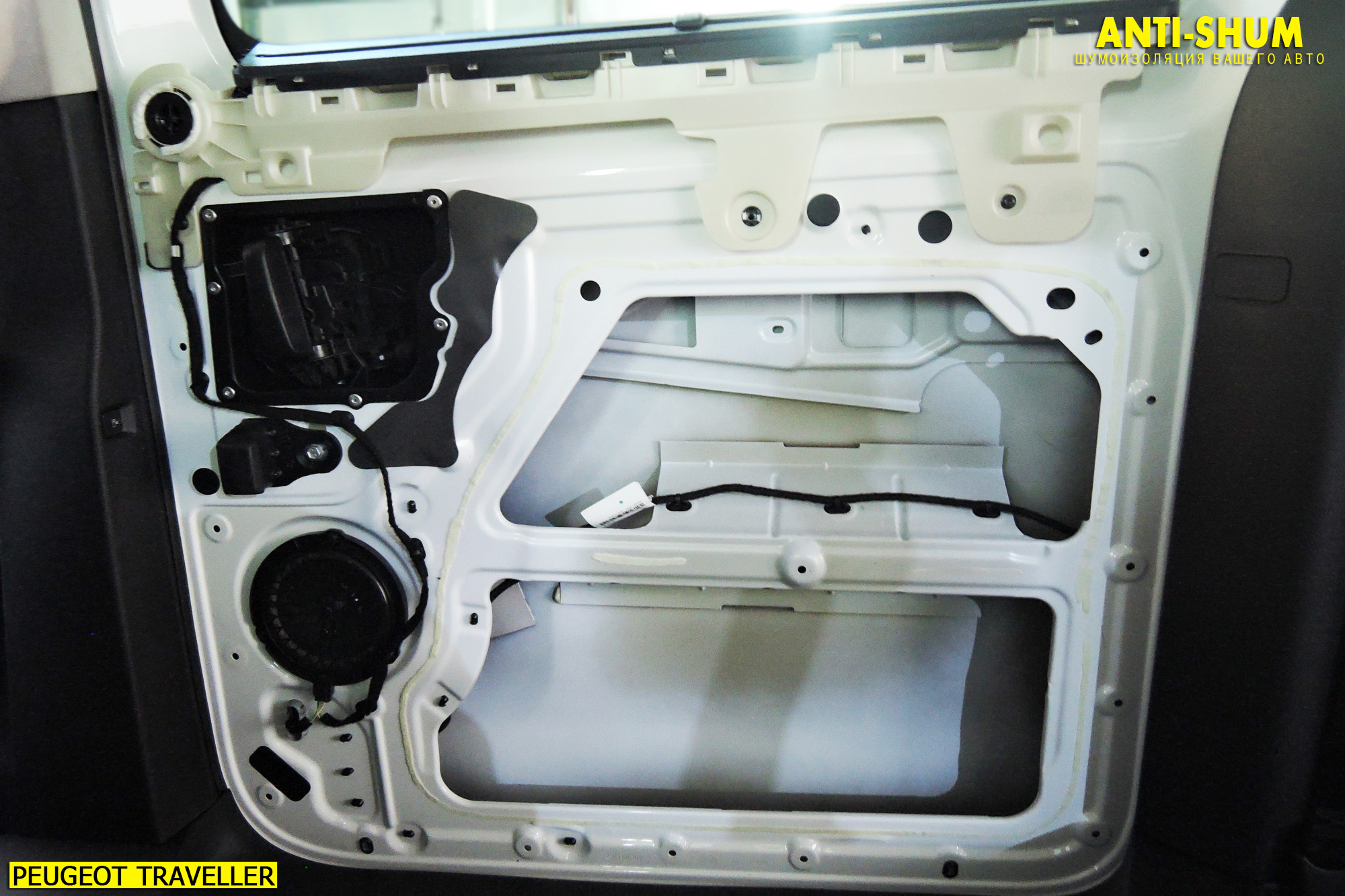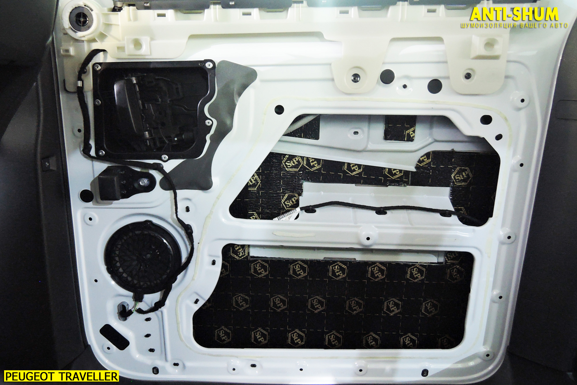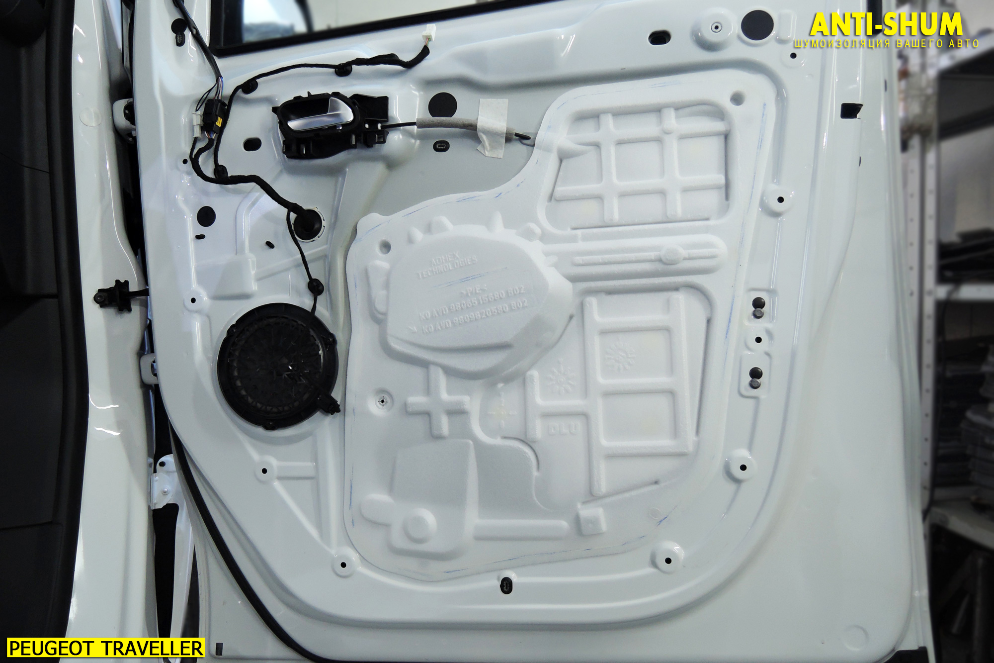 Новенький Peugeot Traveller приехал к нам на шумоизоляцию с жалобами на шумный двигатель, «пустые» и звонкие двери, невнятное звучание штатной акустики, высокий общий уровень шума в салоне и надоедливый стук в правой части передней панели. Так как автомобиль используется для частых дальних поездок, владелец машины выбрал максимальный вариант шумоизоляции «ПРЕМИУМ», а также заказал дополнительные услуги по шумоизоляции передней панели со снятием, а также шумоизоляции колесных арок и подкрылков.